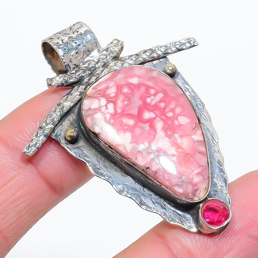 Natural Rhodochrosite, Rubillite Gemstone 925 Sterling Silver Pendant 1.97" AP-8198