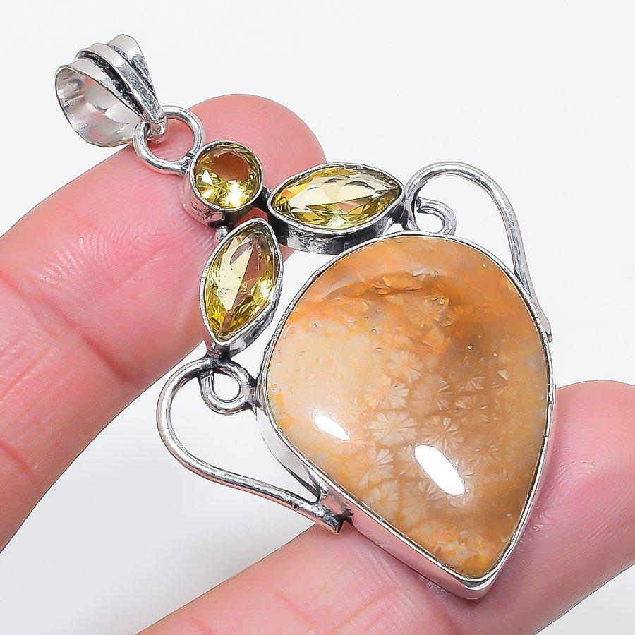 Natural Fossil Coral, Citrine 925 Sterling Silver Jewelry Pendant 2.40" AP-13498