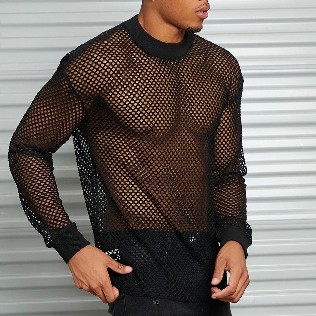 Мужская модная дышащая сетчатая футболка с длинным рукавом и прозрачными вставками