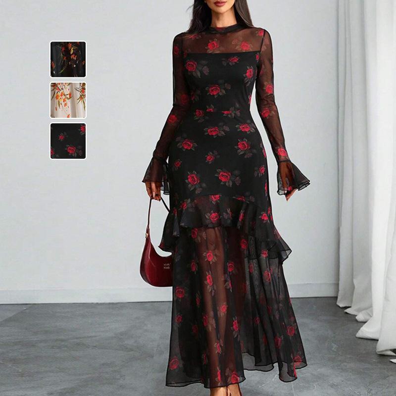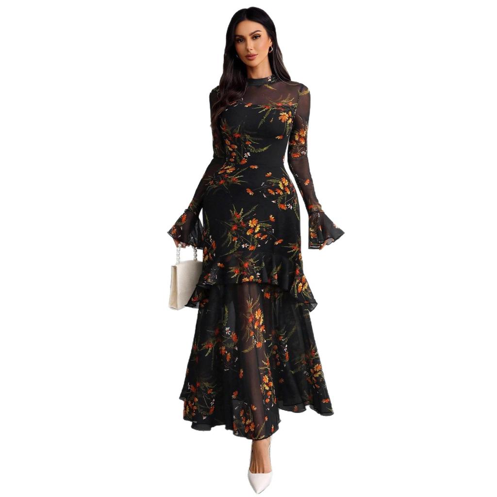 Сделайте смелое и элегантное заявление в этом потрясающем платье макси с цветочным принтом.. С высоким воротом и драматичными рукавами-колоколами, оно имеет летящую юбку, которая добавляет движения и грации.. Платье изготовлено из мягкой смеси тканей, сочетающей юбку с цветочным принтом и нежный сетчатый лиф, создавая красивый контраст.. Идеально подходит для создания изысканного и привлекательного образа для любого особого случая.