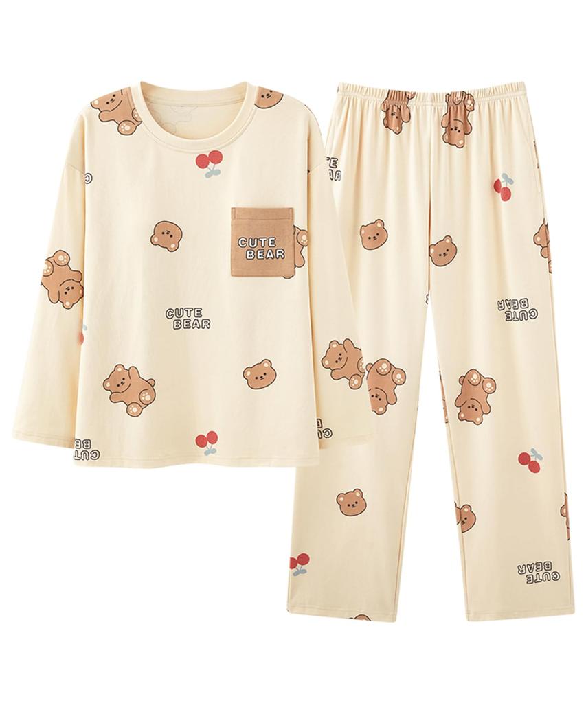 PHOLEEY's 100% cotton women's pajamas feature a cute Korean-inspired design featuring a bear and cherry print. This long-sleeved top and pants set is perfect for spring and fall. Crafted from natural, skin-friendly materials, the built-in cups make them comfortable even without a night bra. These loungewear are perfect for relaxing at home, traveling, hospital stays, or as a gift.
