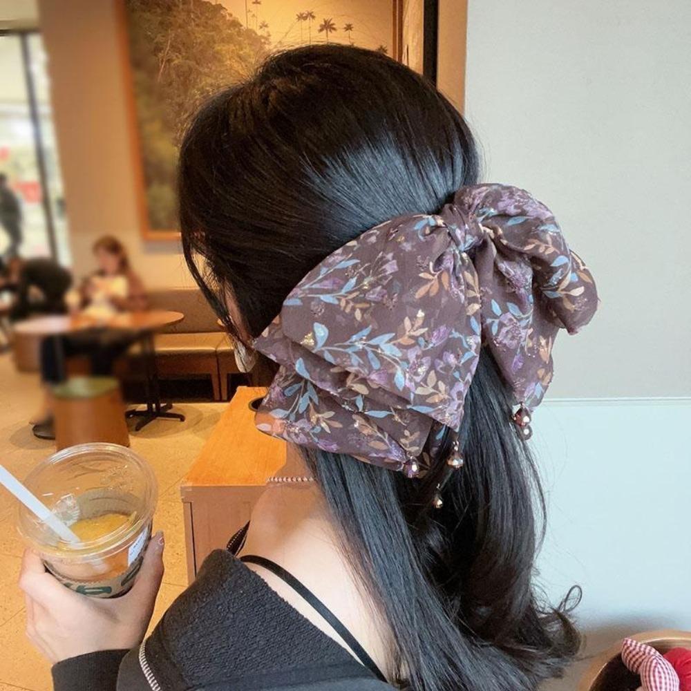 French Style Chiffon Hair Claw Large Women Hair Grab Clip Crystal Bow Shark Clip Daily