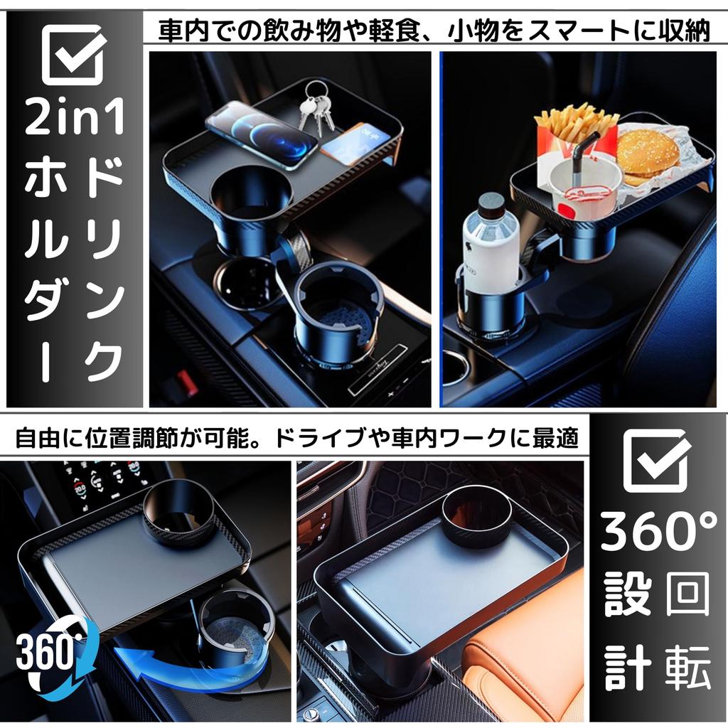 [Integrated Car Drink Holder & Tray Design] This 2-in-1 drink holder design allows you to store drinks, snacks, and small items in your car. Perfect for driving or working in the car. [Rotating Cup Holder for Versatile Use] This car cup holder accommodates bottles and cups with diameters of approximately 6-9cm. The rotating adjuster allows it to fit a variety of sizes. *Please check your installation space in advance. [Easy Installation & Secure Fixation] This car storage accessory can be easily installed by anyone without tools. It provides stability while driving, allowing you to safely store drinks and small items. *Please be careful during severe shaking or sudden braking. [Lightweight & Durable Car Accessory] Made of ABS resin and silicone, this lightweight and durable cup holder/tray is perfect for everyday use and long drives. *Please check the texture of the material beforehand if you are concerned about the feel of the material. Product Specifications: Size: Drink holder approximately 6cm x 13.8cm, tray approximately 23cm x 14.5cm, Compatible cup size: Diameter approximately 6-9cm, Material: ABS resin, silicone, Color: Black, Accessories: Main unit only (no installation tools required)