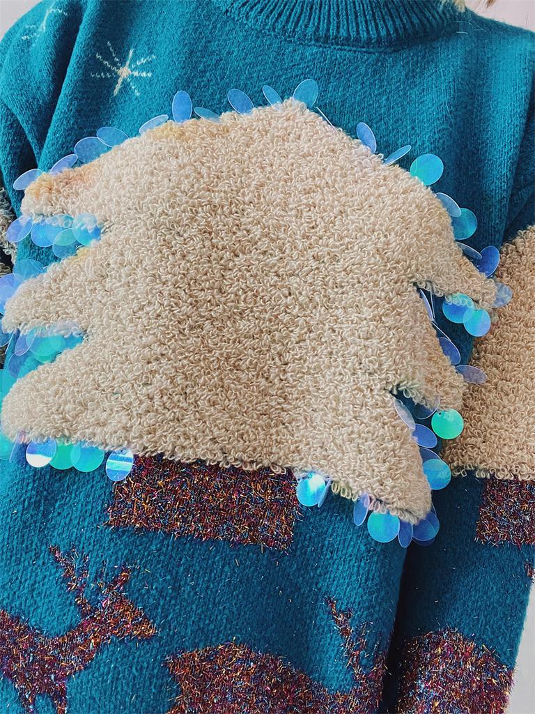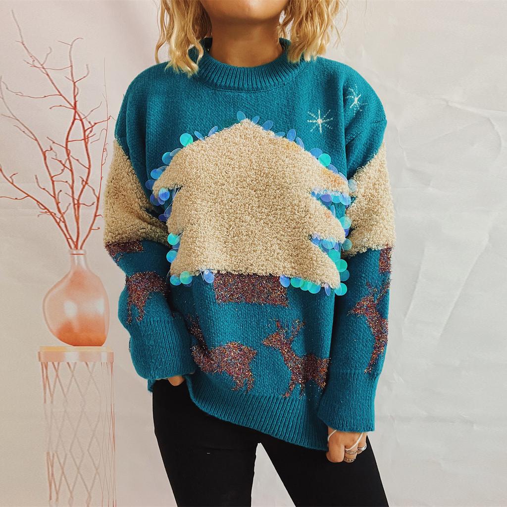 Рождественский праздничный свитер ручной работы с пайетками, жаккардовый толстый пуловер с изображением рождественской елки и оленя 3605 KTB