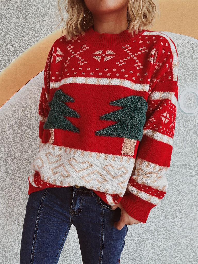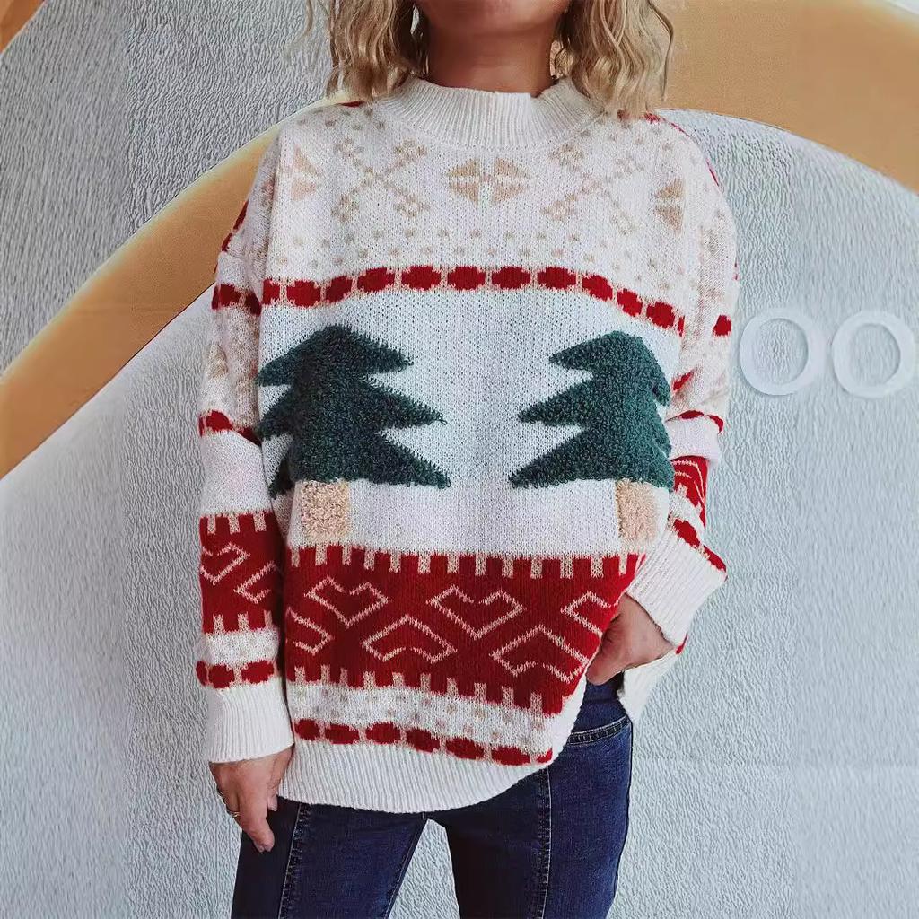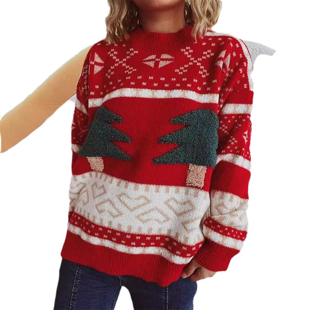 Женский повседневный рождественский свитер с круглым вырезом, вязаный, с мультяшным жаккардовым узором в виде елки, праздничный новогодний свитер 3517 KTB