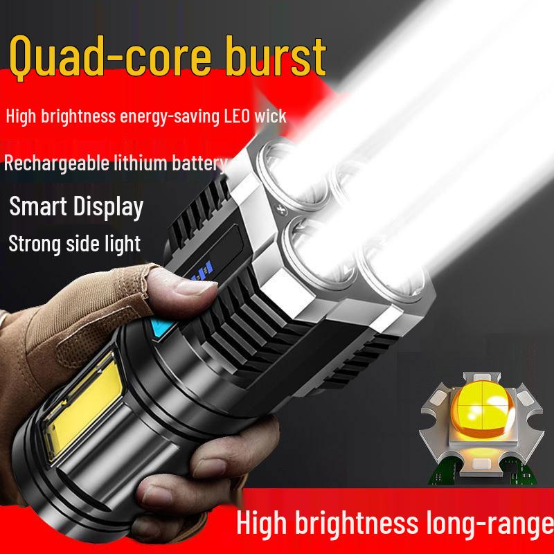 Rechargeable Cross-Border COB LED Flashlight with Four Bright Lights and Long-Range Spotlight.