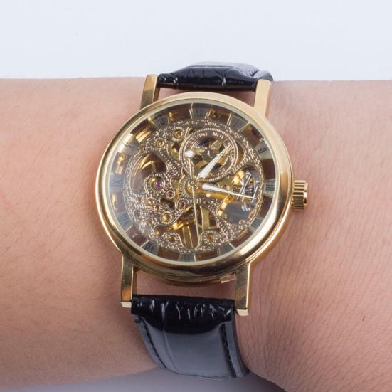 Мужские модные роскошные наручные часы с полым скелетоном и круглым циферблатом из искусственной кожи с ремешком