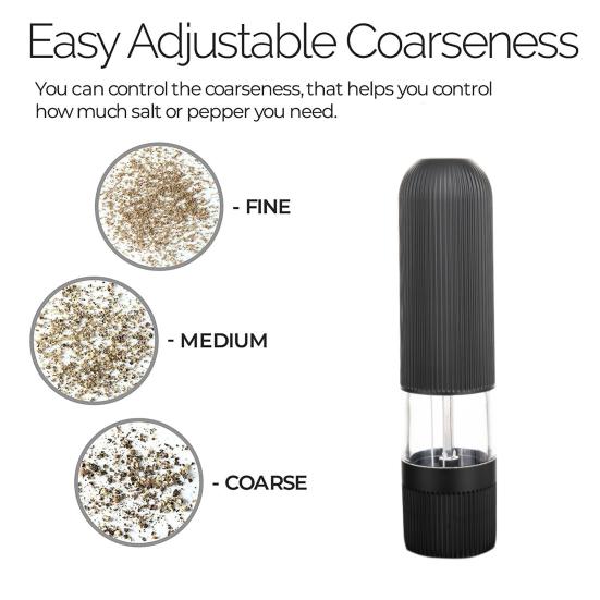 By turning the black knob at the bottom to easily adjust the thickness of the salt and pepper to achieve perfect grinding and seasoning.