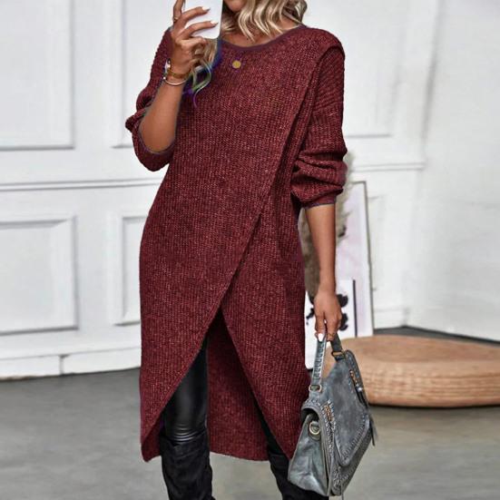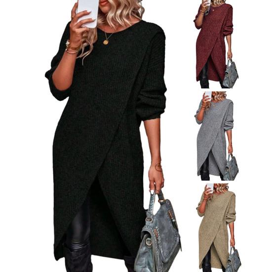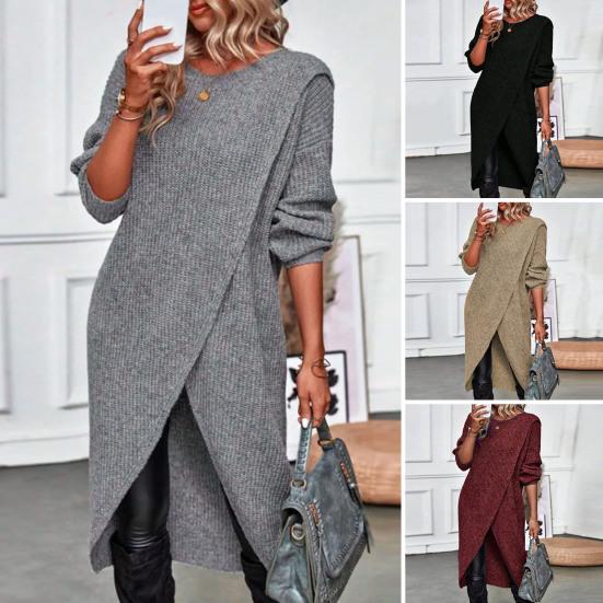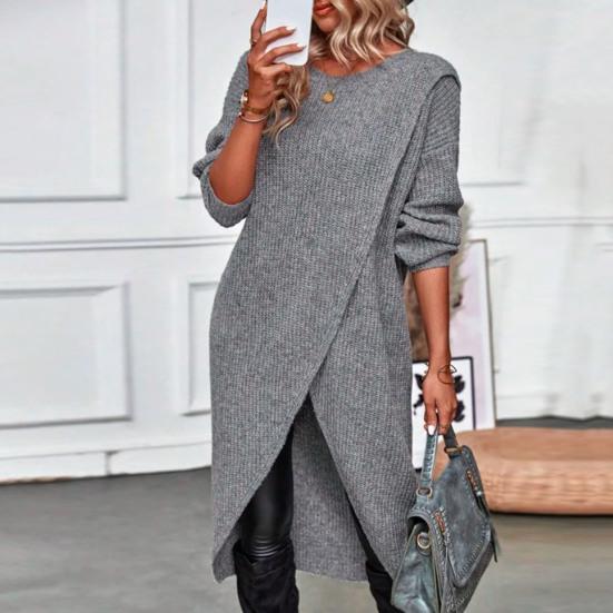 Длинное платье с круглым вырезом и неровными деталями для создания стройнящего эффекта..