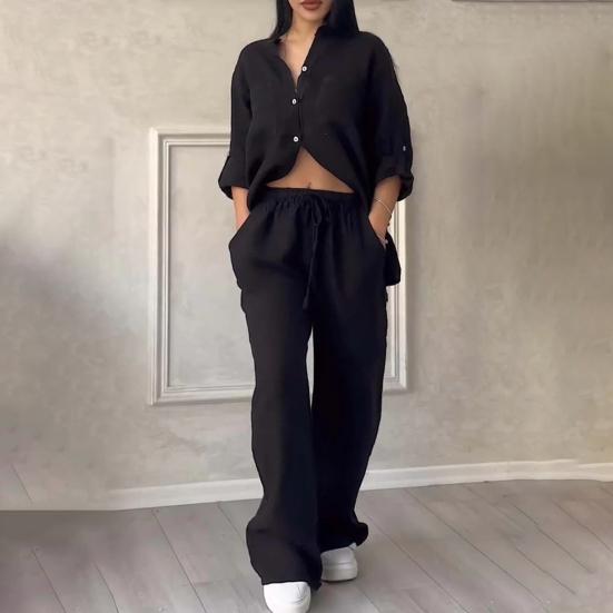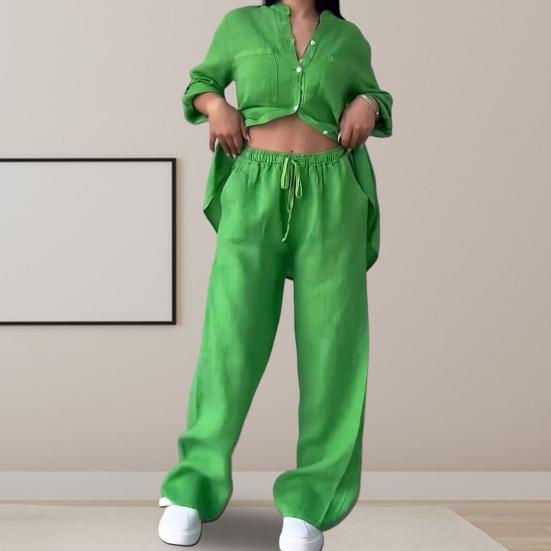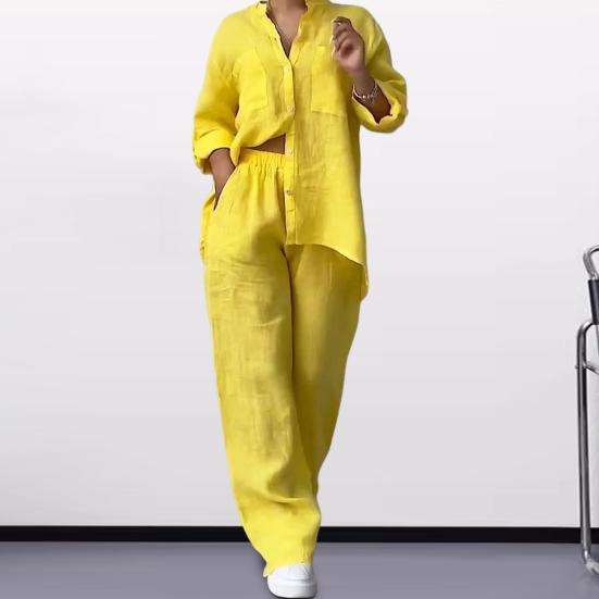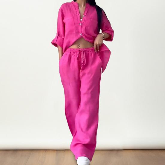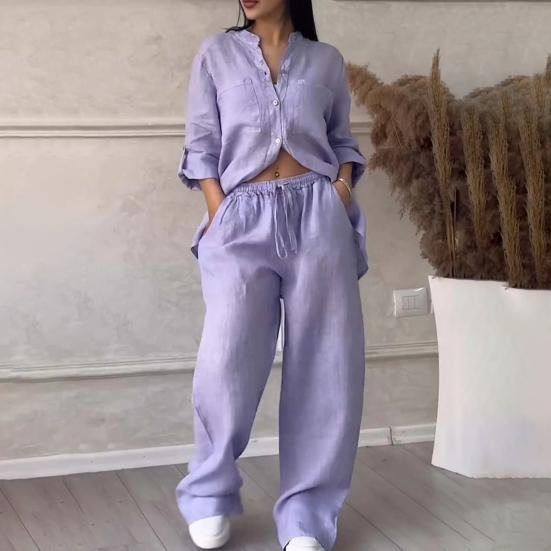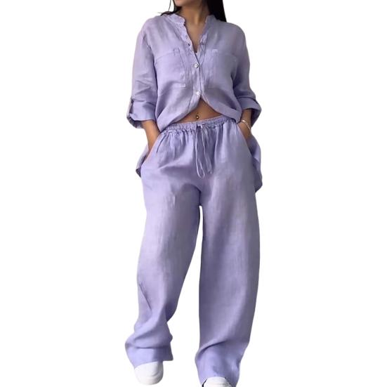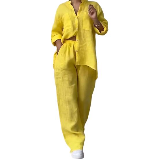 Этот женский костюм изготовлен из смеси хлопка и льна, обеспечивающей воздухопроницаемость и комфорт весной, летом и осенью.. Брюки имеют очень эластичный пояс, подходящий для всех типов телосложения, обеспечивающий свободную посадку, обеспечивающую стильную и удобную посадку..