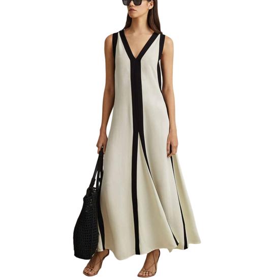 Это элегантное женское платье имеет простой дизайн с контрастными черными, бежевыми и белыми цветами, излучая элегантность и моду.. Длинное платье с V-образным вырезом имеет свободный крой и уникальные контрастные детали со складками, которые не только обеспечивают защиту, но и создают эффект стройности..