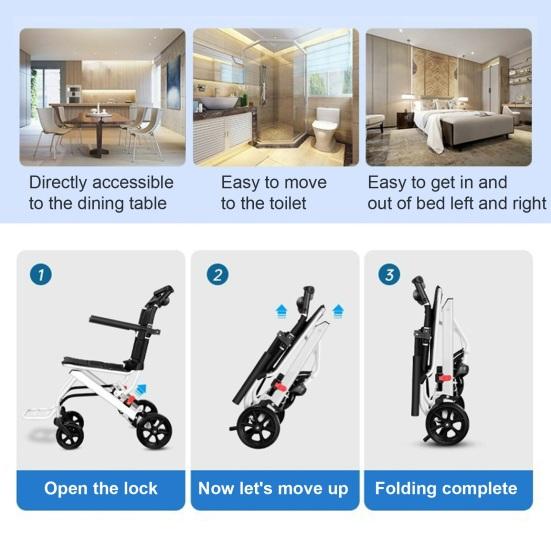 Компактная сверхлегкая конструкция: Эта складная инвалидная коляска весит всего 8,2 кг, она невероятно легкая и портативная.. Компактный размер в сложенном виде делает его удобным для хранения в сумочке или багажнике, идеально подходит для путешествий на самолете, поезде или в любых приключениях.