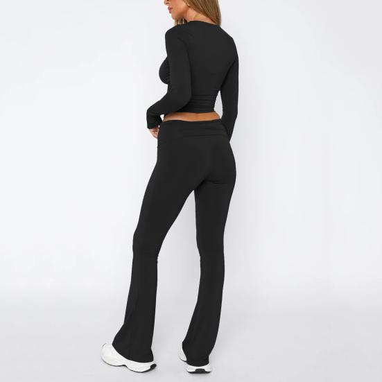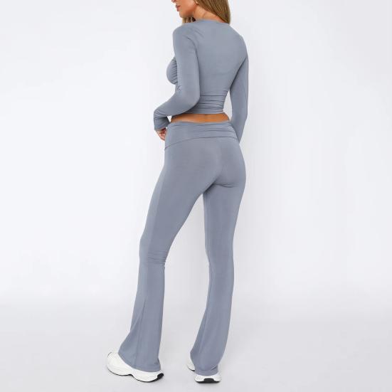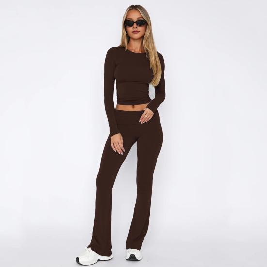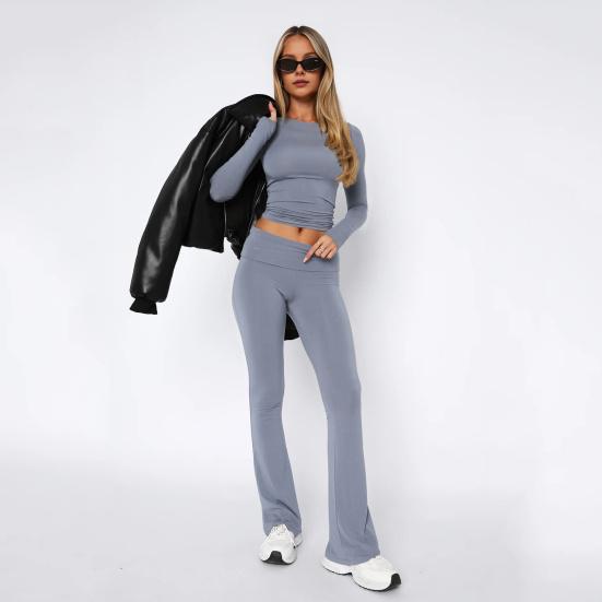 Шикарный стиль: Ощутите простоту с этим однотонным костюмом, включающим топ с круглым вырезом, длинными рукавами и узкие расклешенные брюки.. Повседневный стиль для ежедневных поездок на работу излучает элегантность и очарование, подходя широкому кругу пользователей.