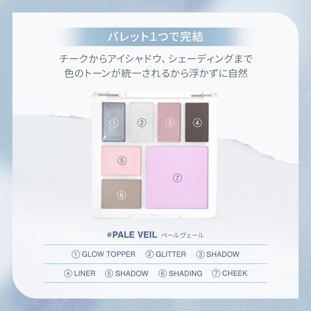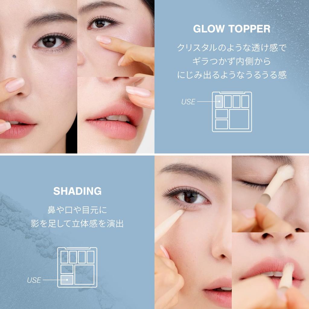 Tone up anyone*. A translucent multi-palette. Achieve dewy, radiant highlights for a dewy complexion. ■ Suitable for all skin tones. Blends seamlessly with cool colors. The pale, whitish-filtered color blends seamlessly with a variety of skin tones, despite its low saturation. Achieve a sheer finish, as if naturally toning up*. ■ Glowing Glow. Glow Highlight. A gel highlighter with a crystal-like sheer glow. Formulated with oils that lock in skin moisture, it creates a dewy, radiant look that seems to ooze from within without any glare. ■ Complete your makeup look with just one palette. From blush to eyeshadow and shading. The uniform color tone creates a natural, uncluttered look. *Depending on makeup effect