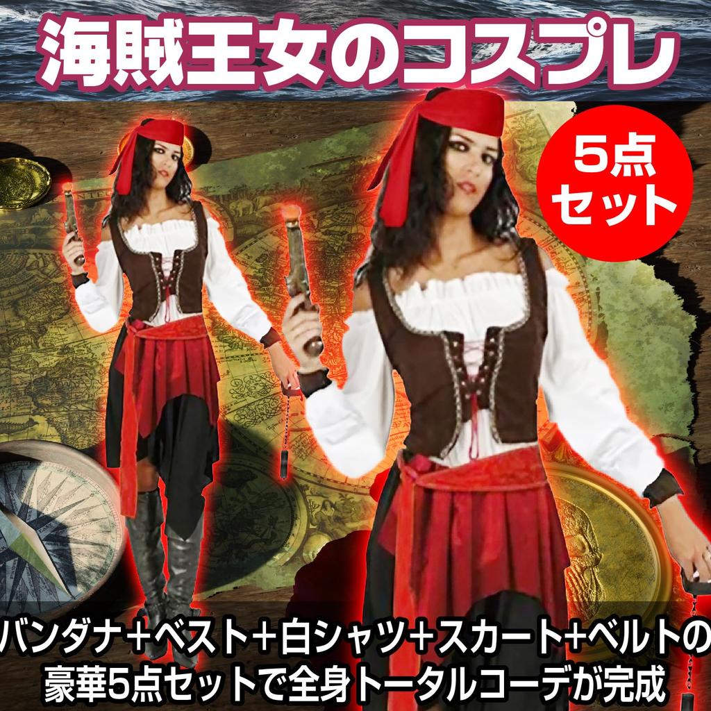 [Комплект для косплея пирата] Станьте пиратом с этим роскошным набором костюма для косплея пирата из 5 предметов, включающим бандану, жилет, белую рубашку, юбку и пояс для завершения образа.