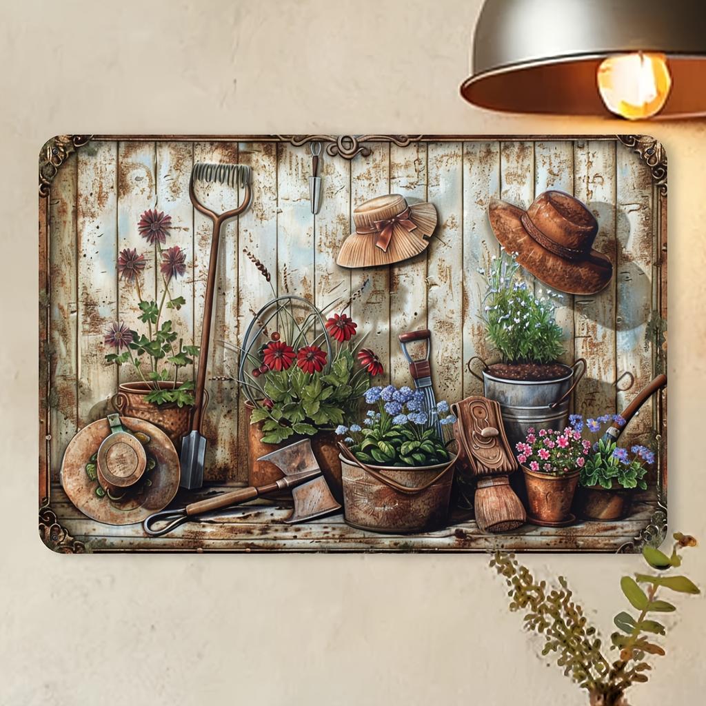 [1 шт. Винтажная табличка] Деревенская винтажная цветочная металлическая табличка | Декор для стены сада с цветами, лейкой и шляпами | Прочное настенное искусство