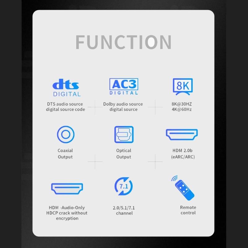 Supports eARC andARC functions. Supports audio separation of PCM, 7.1lpcm, DTSAC-3, and otheraudio in the input HDMIcompatibleHD signal, and outputs from fiber optic3.5mm, and HDMIcompatible audio only output ports.