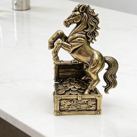 Универсальная декоративная привлекательность: Этот латунный конь, созданный дополнять разнообразные стили интерьера, от современного минимализма до традиционного китайского декора, органично вписывается в различные обстановки.. Он украшает рабочие столы, полки и шкафы вневременной элегантностью, подходящей как для профессиональной, так и для домашней обстановки.