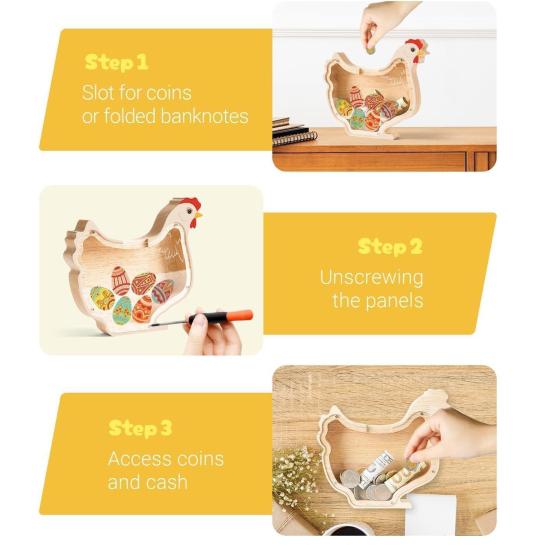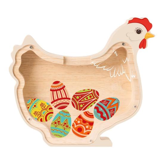 Уникальный дизайн в форме цыпленка с красочным дисплеем в виде яйца: Эта очаровательная копилка в форме цыпленка выделяется своей очаровательной формой и отличительным прозрачным дизайном, который демонстрирует разноцветные яйца внутри.. Каждая добавленная монета вносит свой вклад в восхитительный визуальный сюрприз, делая процесс накопления увлекательным и мотивирующим для юных вкладчиков, которым нравится видеть свой прогресс в игровой форме.