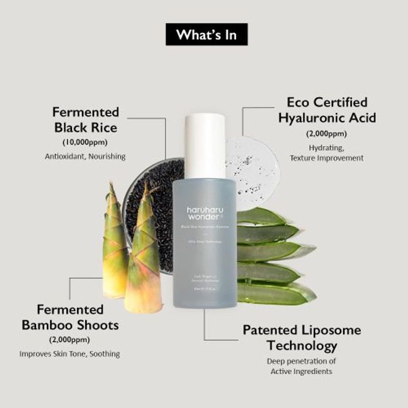 Lightweight gel-like anti-aging essence made with fermented black rice, bamboo shoot bark extract and hyaluronic acid that leaves skin soft and fresh with zero sticky residue.