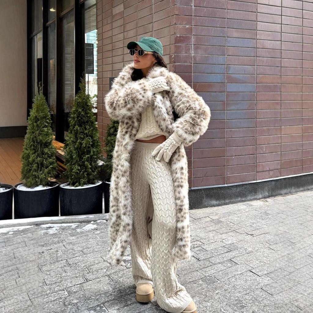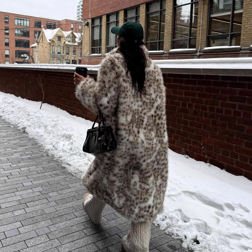 VAYLA Леопардовое пальто из искусственного меха Женское Длинное пальто с отложным воротником, рукавами полной длины, открытой строчкой, толстое, свободное, элегантное, куртка на осень-зиму
