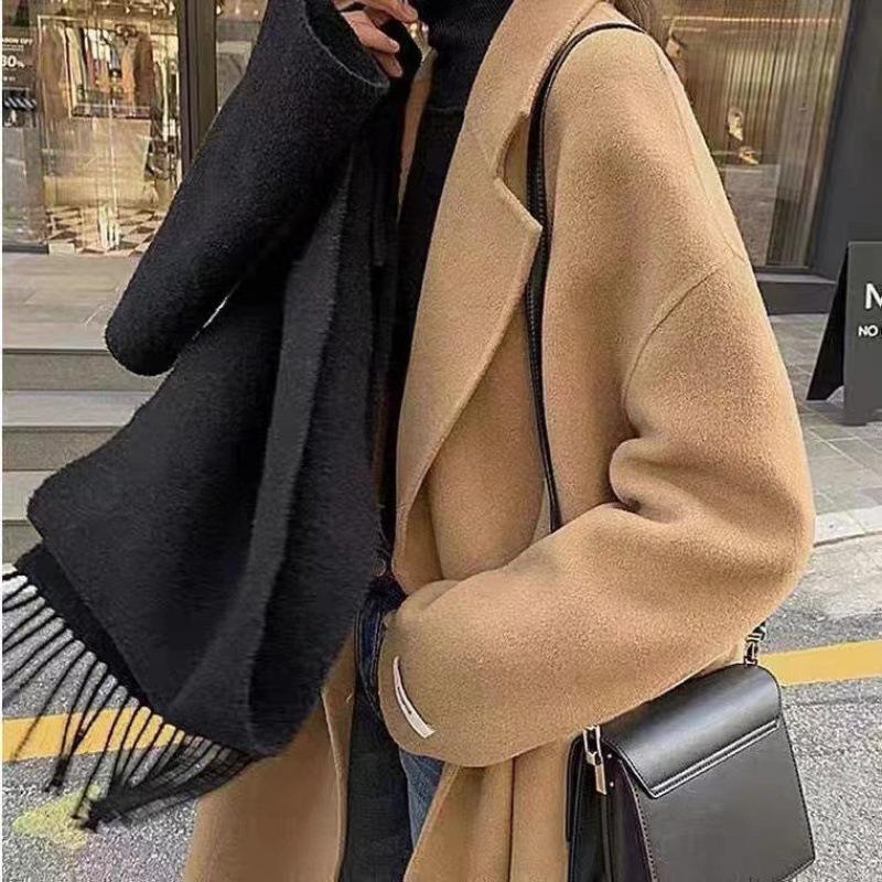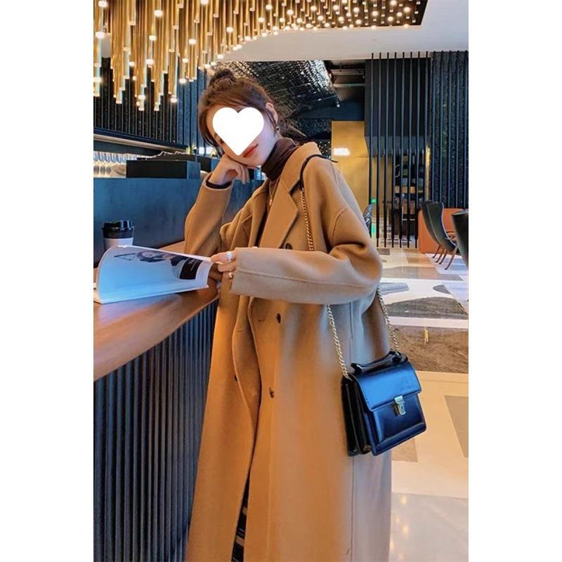 Верблюжьего цвета шерстяное пальто для женщин, средней длины, осенне-зимнего темперамента, модное двубортное шерстяное пальто
