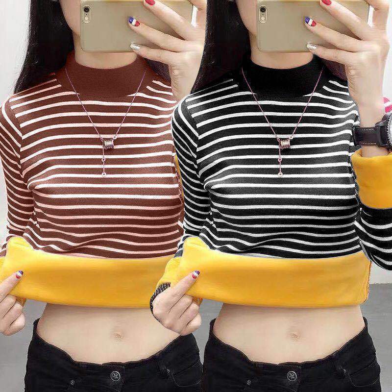 Autumn and Winter Korean Style Striped Warm Velvet Thickened Bottoming Shirt Top with Large Size Women's Slimming T-shirt