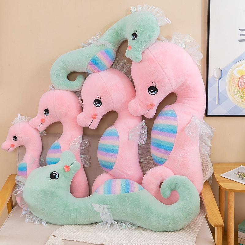 Crafted with utmost attention to detail, this plush toy features a cartoon-inspired seahorse shape. Its vibrant and eye-catching colors, including pink and green, make it stand out from the crowd. Whether you're a fan of marine life or simply appreciate cute and cuddly toys, this seahorse plush doll will surely catch your attention.