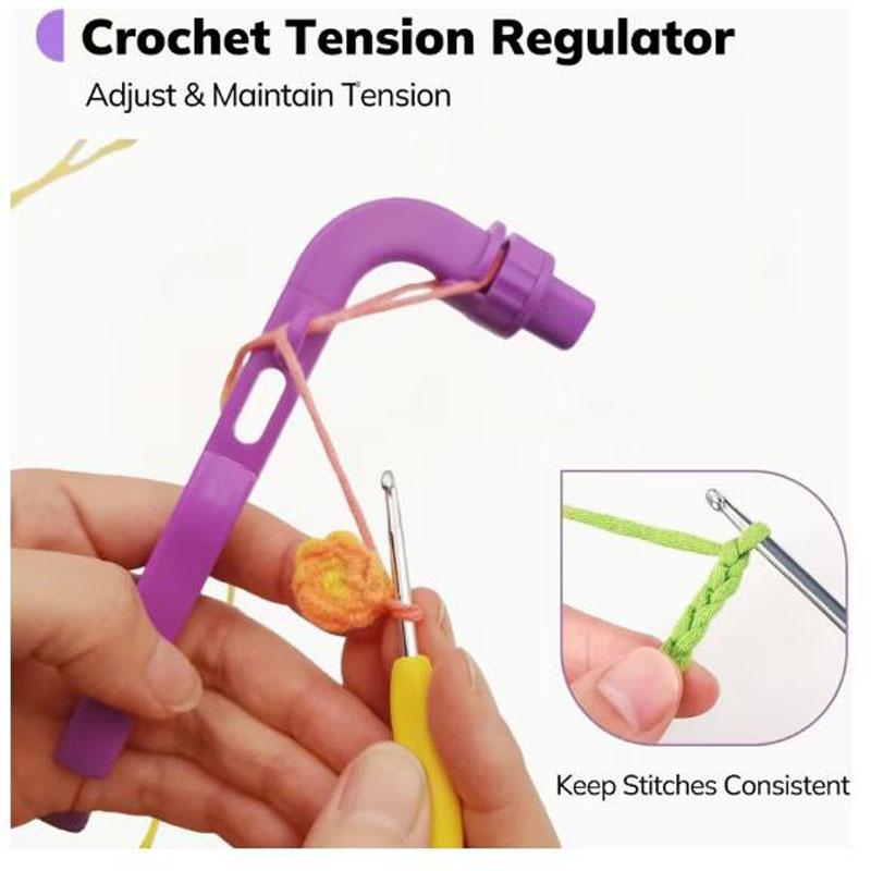 Держатель натяжения для вязания крючком имеет открытую рамочную конструкцию, которая подходит для различных типов крючков и пряжи, и исключает необходимость в запасных частях.;