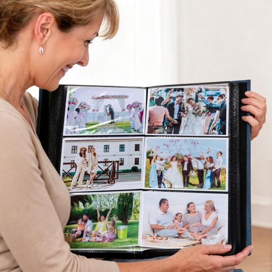 Удобная конструкция с верхней загрузкой: Этот альбом с удобным механизмом загрузки сверху позволяет быстро и без хлопот вставлять фотографии.. Конструкция надежно удерживает каждое фото на месте, предотвращая их выпадение, и позволяет без труда организовывать и переставлять их по желанию.
