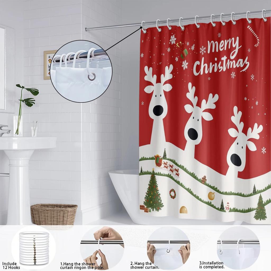 1pc Christmas Reindeer Print Perforated Waterproof Shower Curtain Privacy Multi Size Hanging Curtain 12 Hooks Easy Installatio
