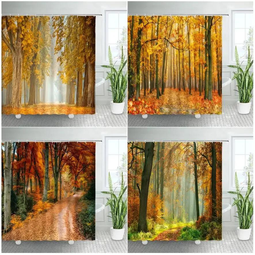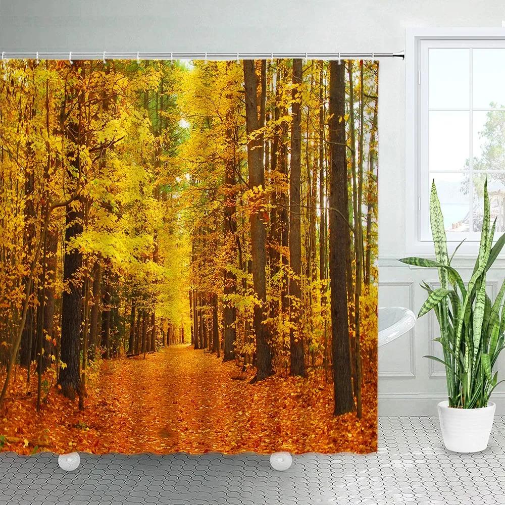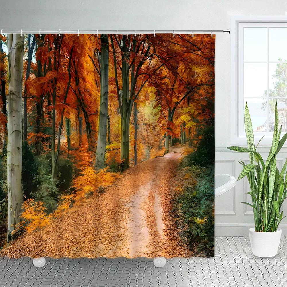 Autumn Forest Landscape Shower Curtain Maple Trees Road Plants Fallen Leaves Rural Scenery Wall Hanging Bathroom Decor Curtain