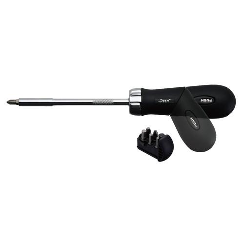 Features: By turning the silver part at the tip of the handle, you can switch between right rotation, fixed, and left rotation. While holding the handle, you can press the button in the center to convert it to a pistol grip, making it easier to apply torque compared to a straight position. Pressing the "PUSH" button from both sides opens the bit storage at the grip end.
