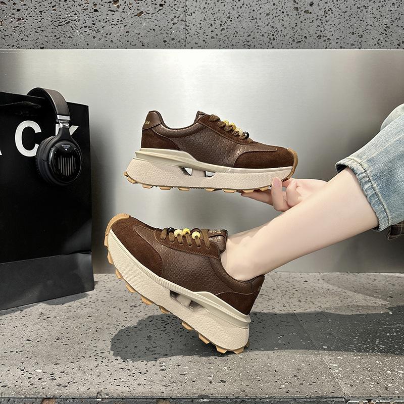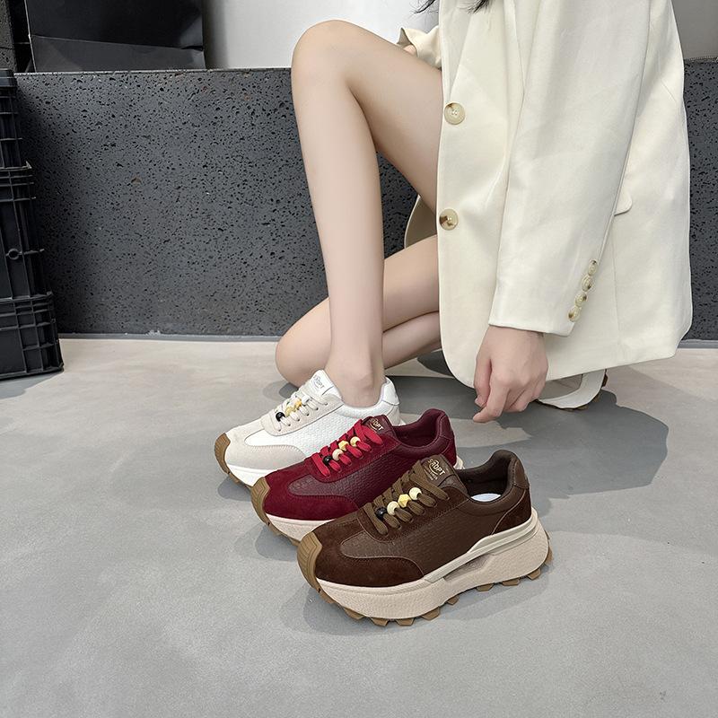 Осень новая кожа круглый носок толстая подошва увеличивающие рост универсальные спортивные туфли женские легкие повседневные туфли