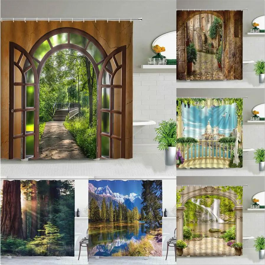 Окно Снаружи Лес Мост Весенний Пейзаж Креативность Занавеска для Душа Дзен Камень Дерево Здание Пейзаж Тканевые Шторы С Хо
