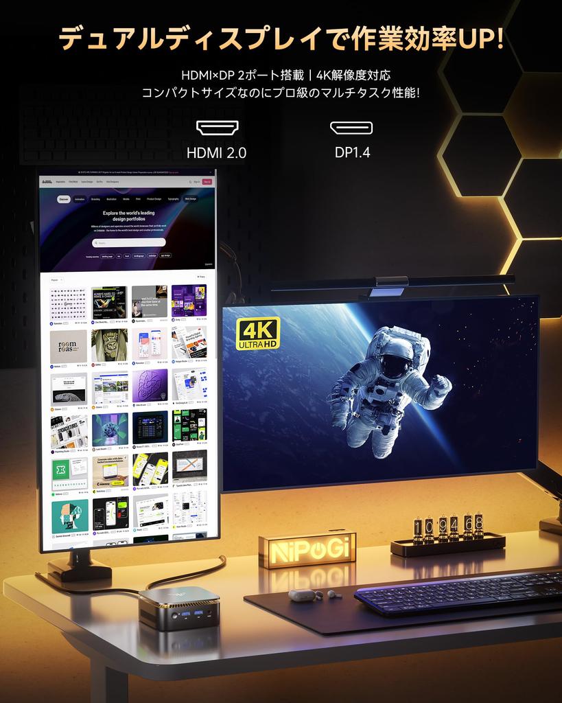 [Поддержка вывода 4K Ultra HD на два экрана и широкий набор интерфейсов, всё в одном!] Мини-ПК NiPoGi E1 N95 оснащен портами DP 1.4 и HDMI 2.0, позволяющими одновременно выводить изображение на два монитора для плавной многозадачности и редактирования видео. Этот мини-ПК оснащен новейшей графикой Intel UHD, что значительно улучшает производительность обработки изображений и видео.. Поддерживая разрешение HDMI 4096x2160@60Гц, он обеспечивает красивое, захватывающее впечатление от просмотра с разрешением примерно в четыре раза больше, чем у Full HD.. Он также оснащен широким набором интерфейсов, включая два порта USB 3.2, два порта USB 2.0, один порт RJ45 (10/100 / 1000Mbps), один разъем DC и один порт 3,5 мм. Этот высокопроизводительный мини-ПК идеально подходит для широкого спектра применений, от бизнеса и удаленной работы до просмотра видео и потоковой передачи контента.