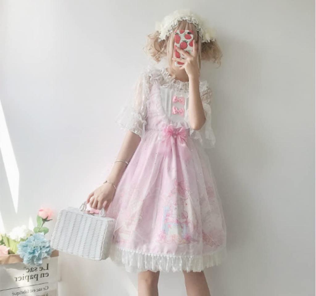 [Особый дизайн] Это очаровательное платье Лолиты JSK выполнено в пастельных тонах и украшено принтом с изображением мягкой белой кошечки! Обильное кружево и оборки украшают грудь и подол. Поскольку это юбка-сарафан, носите ее с блузкой круглый год.. Летом его также можно носить как платье без рукавов!