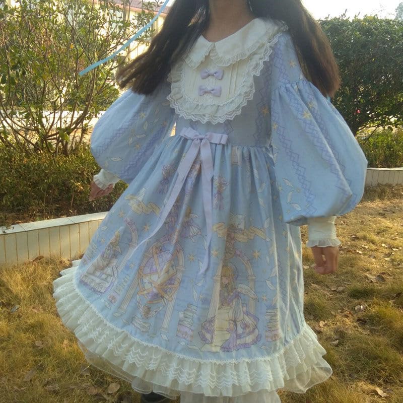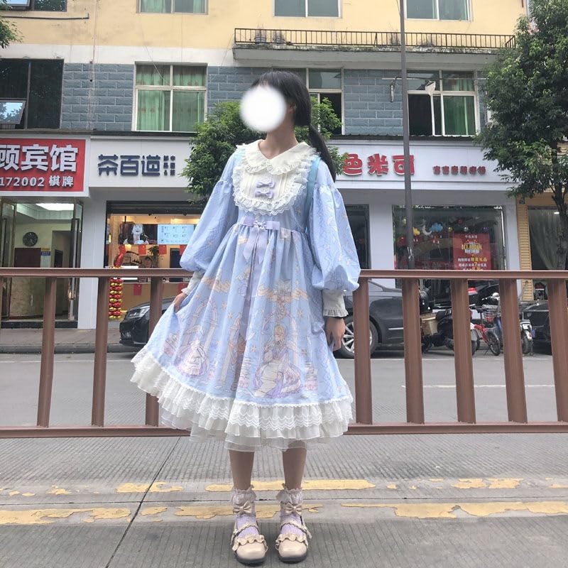 [Особый дизайн] Это платье Лолиты с длинными рукавами украшено милым принтом с куклой-ангелом в пастельной цветовой гамме.. Круглый воротник и грудь украшены пышным кружевом и оборками! Подол юбки также многослойный из нескольких слоев кружева, создавая пышный, приподнятый вид.