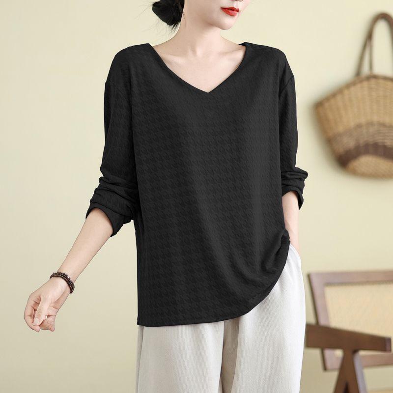 Осень Новый Стиль V-образный вырез Жаккардовый Женский Сращенный Пуловер Свободная Футболка Базовый Топ с Длинным Рукавом