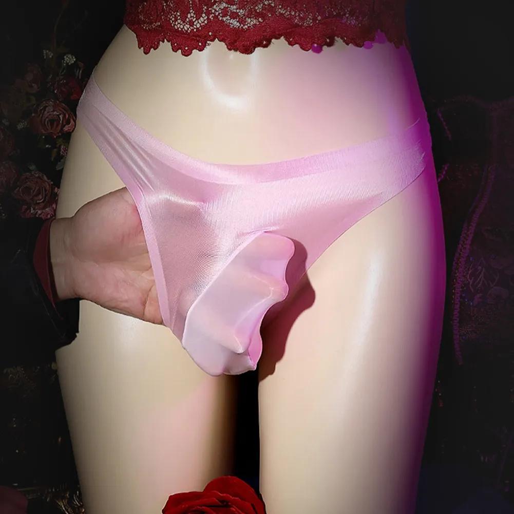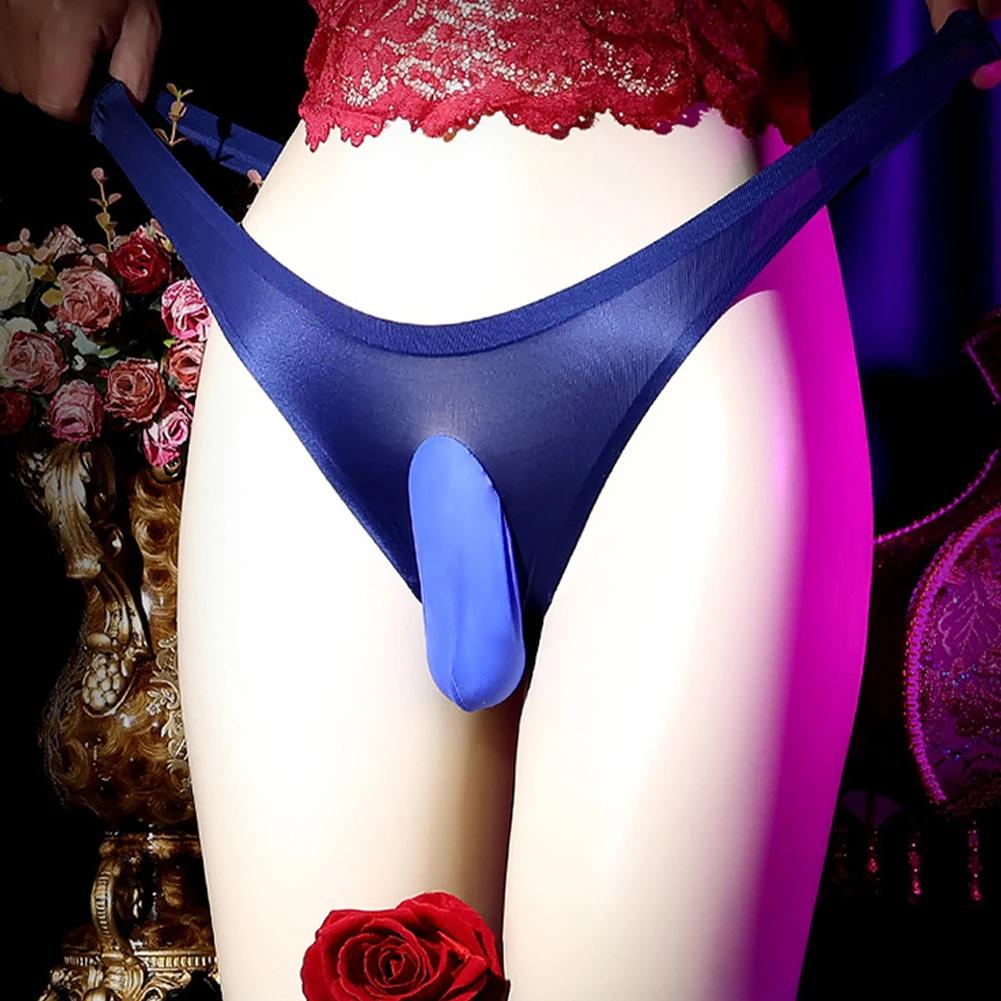 Прозрачные глянцевые стринги из ледяного шелка с карманом для сисси, мужское сексуальное нижнее белье, дышащие, прозрачные, быстросохнущие трусы, эластичные стринги