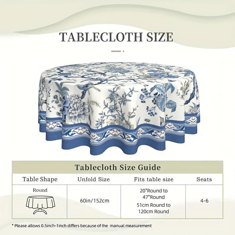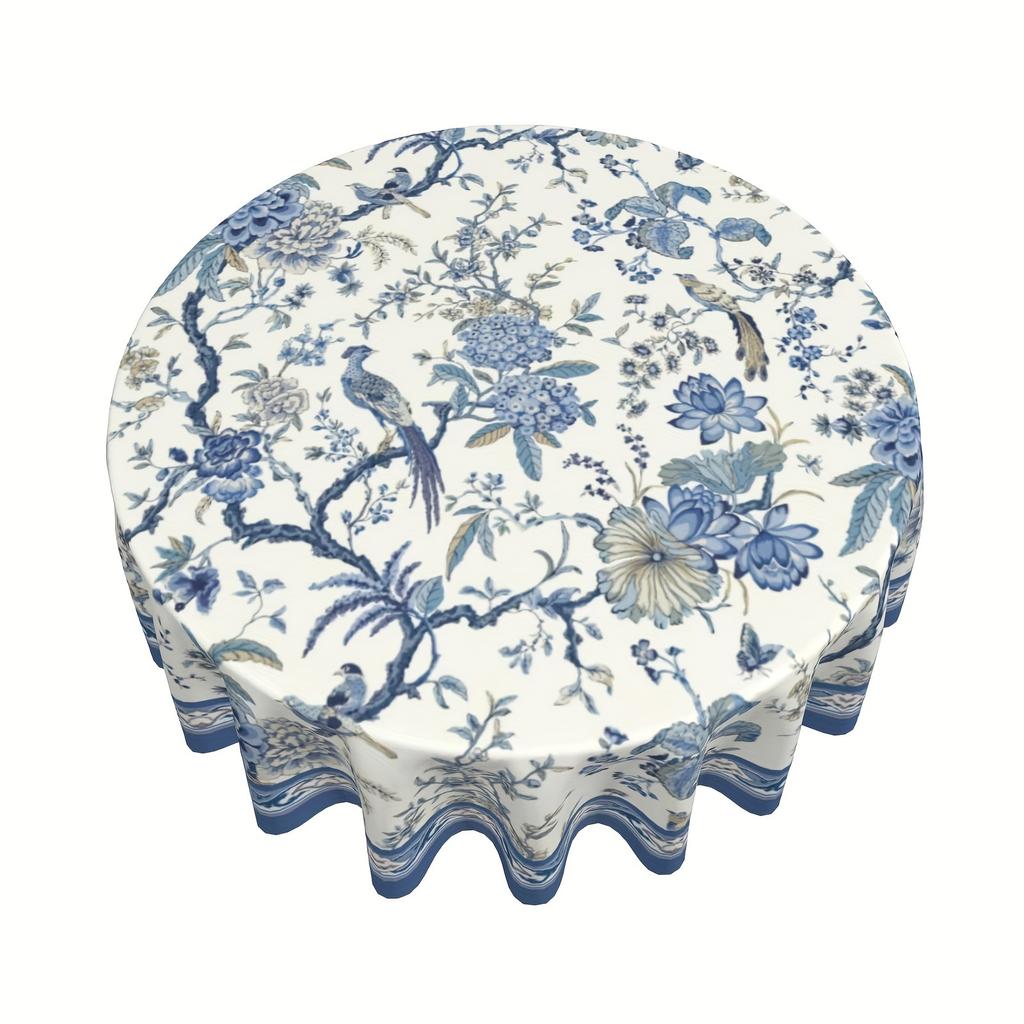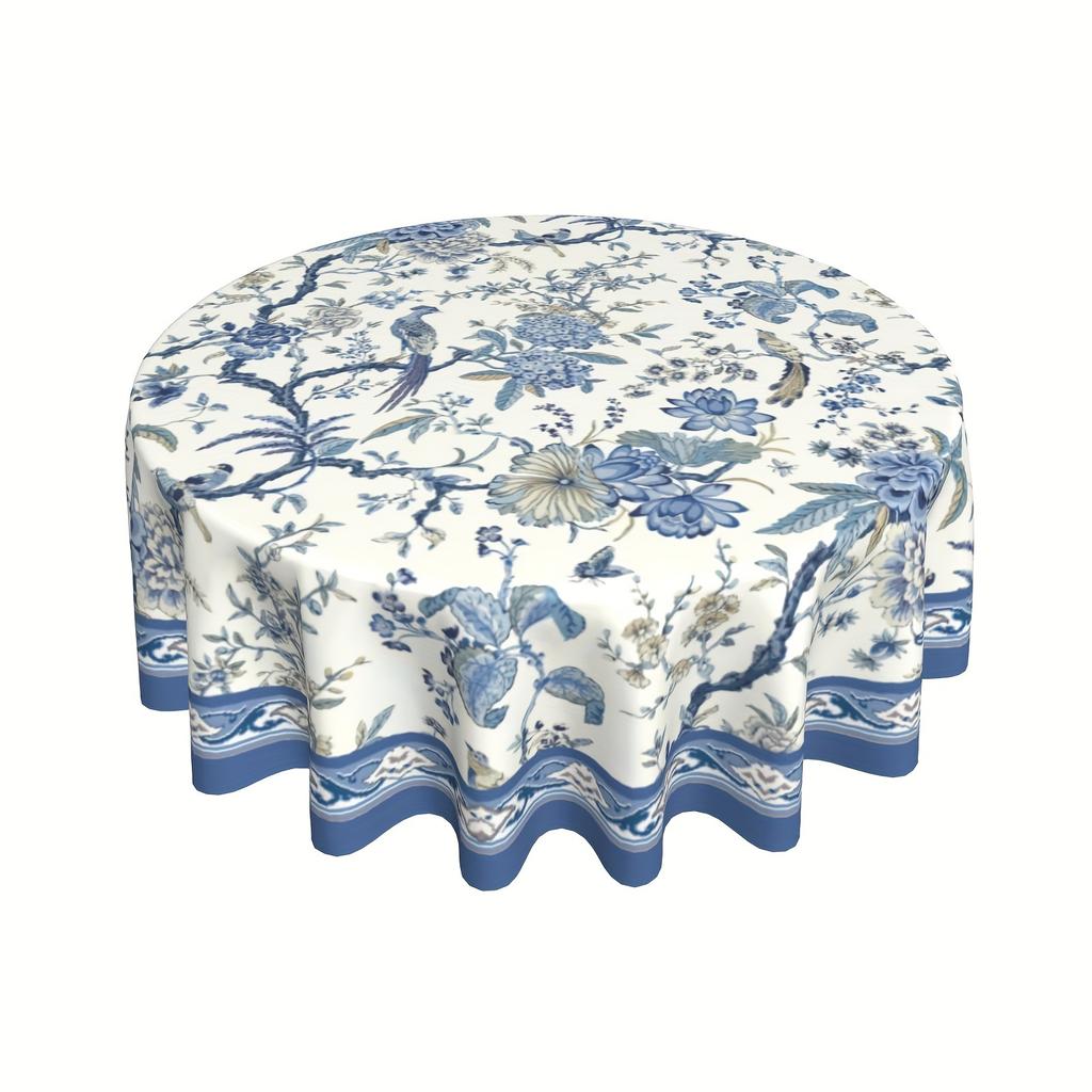 1Pc Chinese Style 60-Inch Round Tablecloth, Blue And White Porcelain Floral & Bird Design, Classic Oriental Style Polyester
