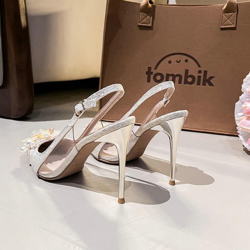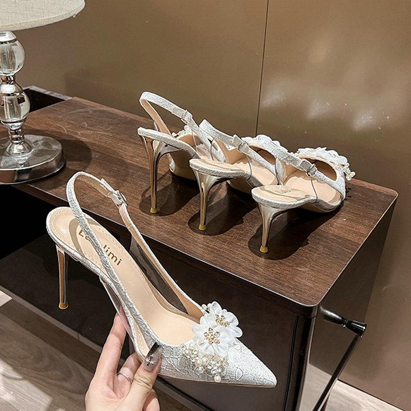 Мода 2025 Новая Невеста Белые Свадебные Туфли Тонкий Каблук Острый Носок Цветок Стразы Каблуки После Пустоты Модные Женские Сандалии