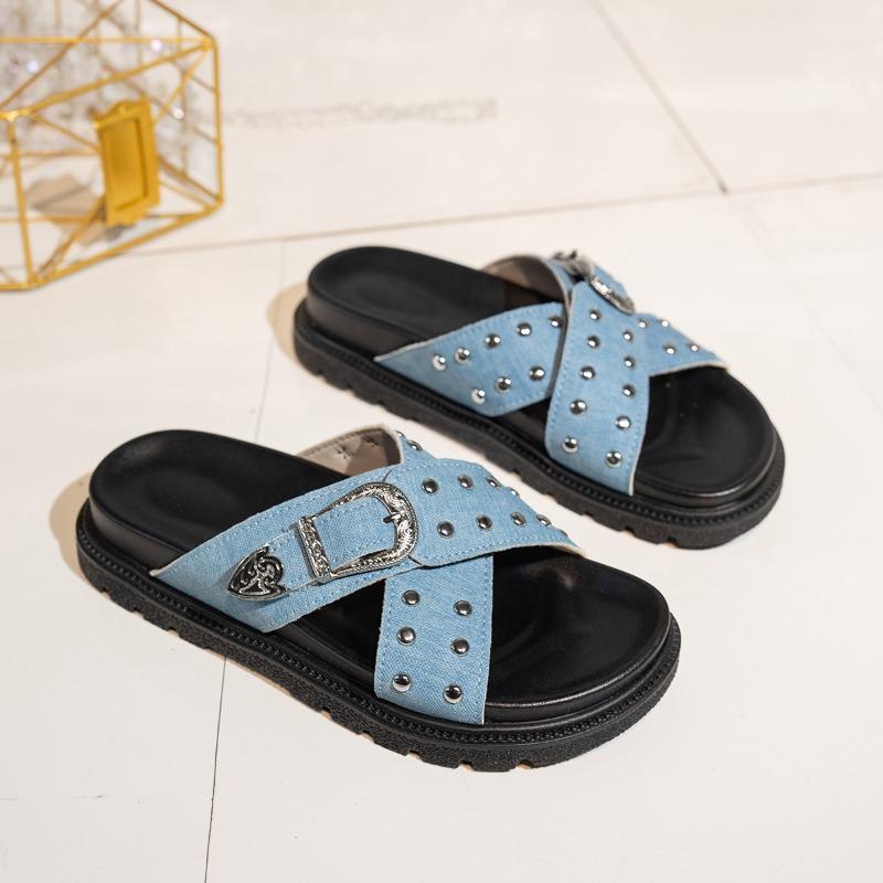 Модные летние новые шлепанцы на платформе Женская мода Круглый носок Открытый носок Металлическая пряжка-заклепка Противоскользящие Износостойкие Сандалии на плоской подошве