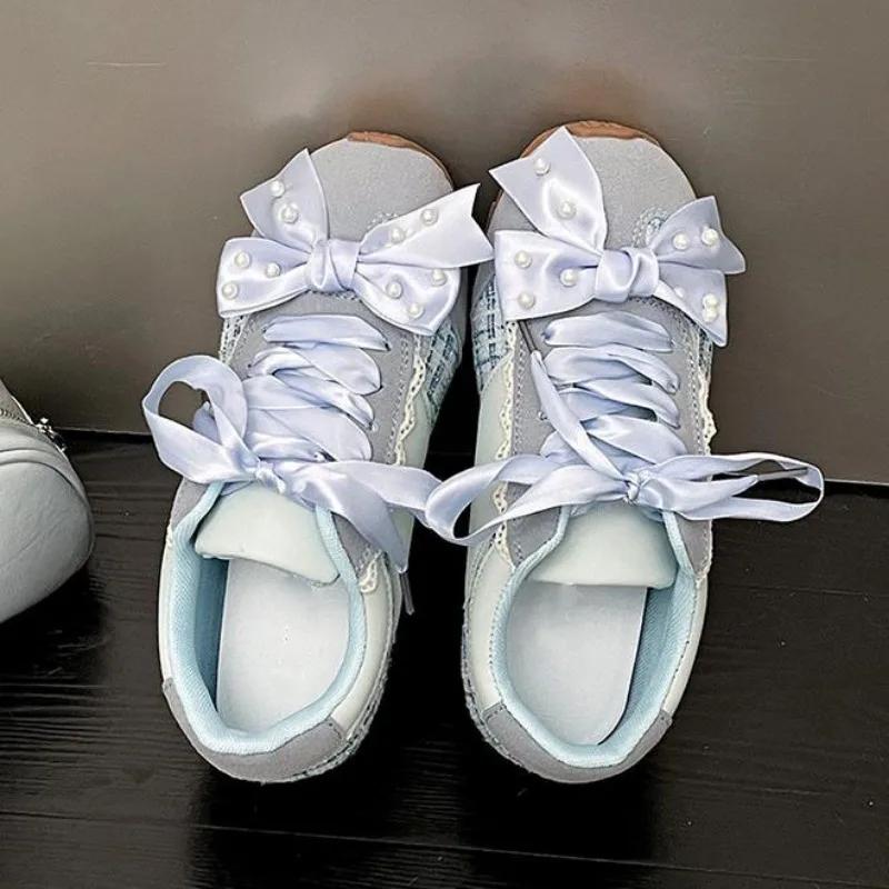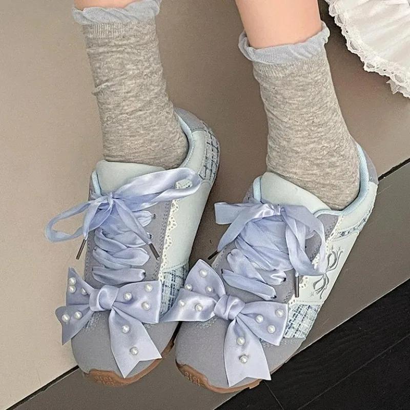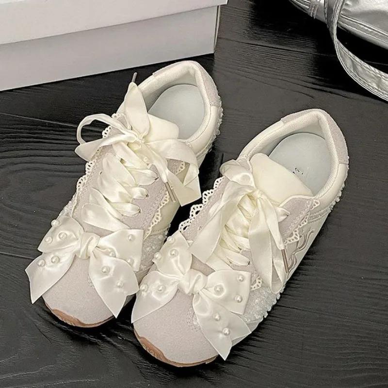 Модные туфли на толстой подошве 2025 с жемчугом, милые балетки с бантиком, женские кроссовки, zapatillas de mujer