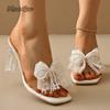 Модные Странные Прозрачные Женские Босоножки на Высоком Каблуке Элегантные Жемчужные Бусины Ремешок на Щиколотке Свадебная Вечеринка Романтический Бант Туфли для Платья Сандалии