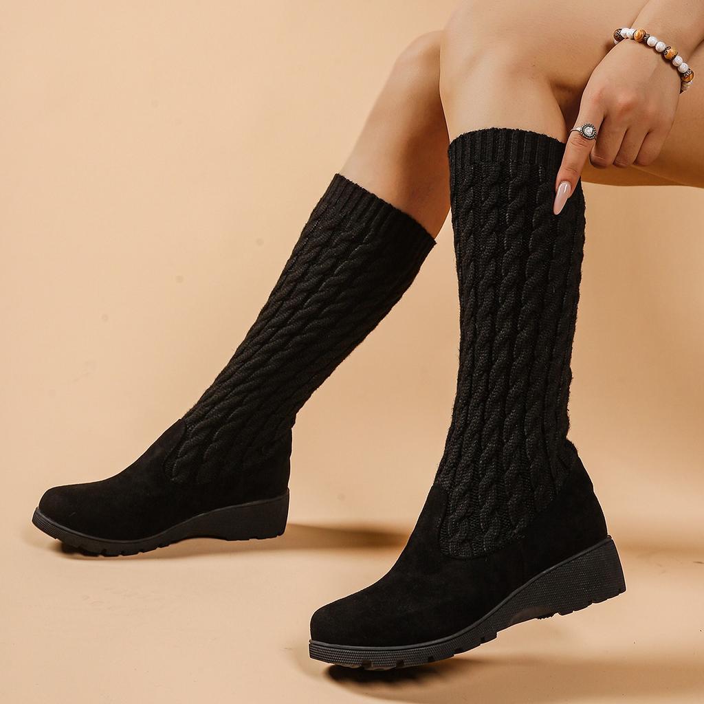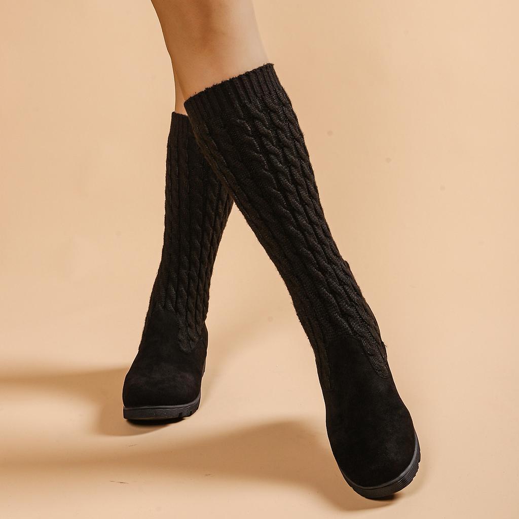 Модные осенне-зимние вязаные высокие эластичные длинные сапоги на толстом каблуке и танкетке, женские сапоги в стиле кэжуал с круглым носком и резиновой подошвой