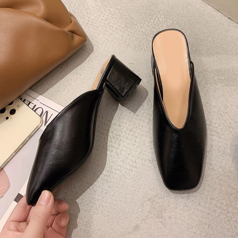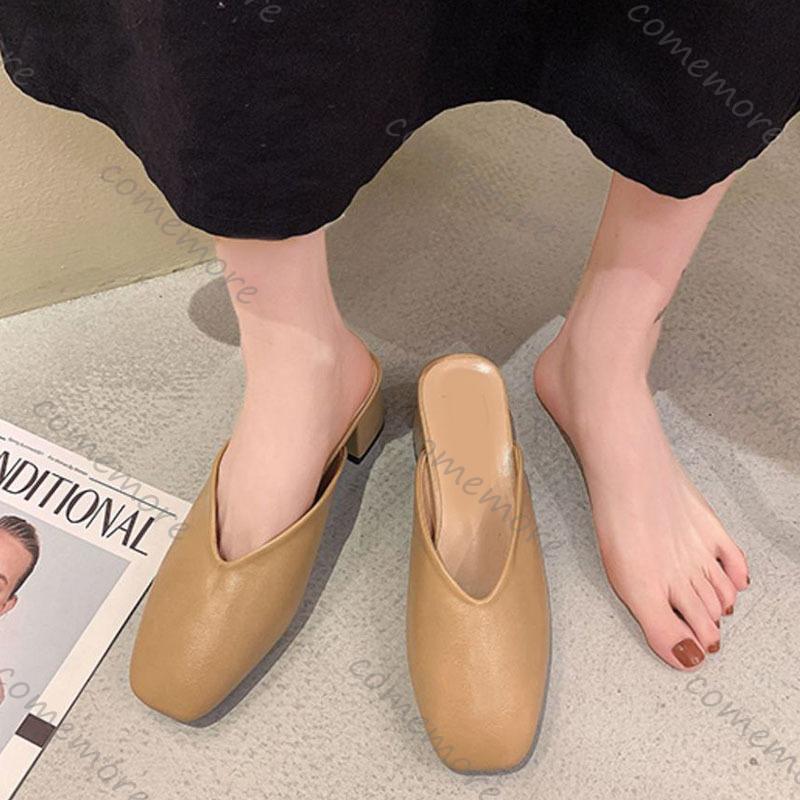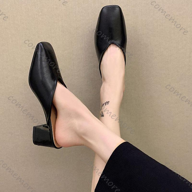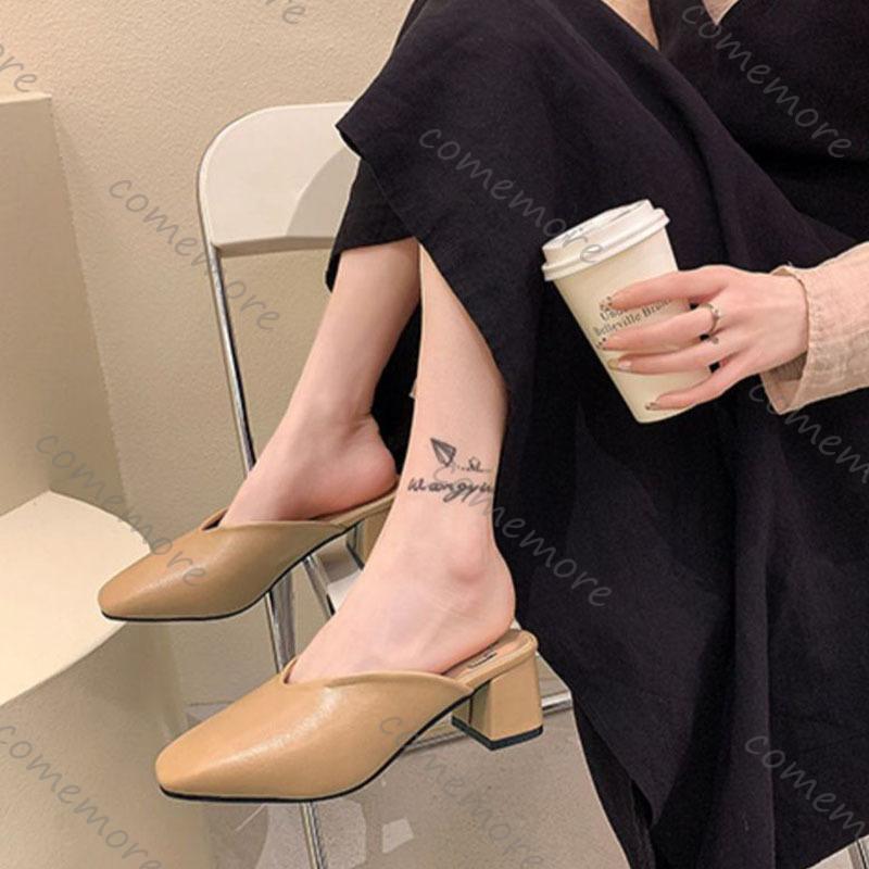 Модные Comemore Baotou Полушлепанцы Женские Летние Новые Уличные Модные Однотонные С Квадратным Носком Толстый Каблук Туфли-лодочки Женские
