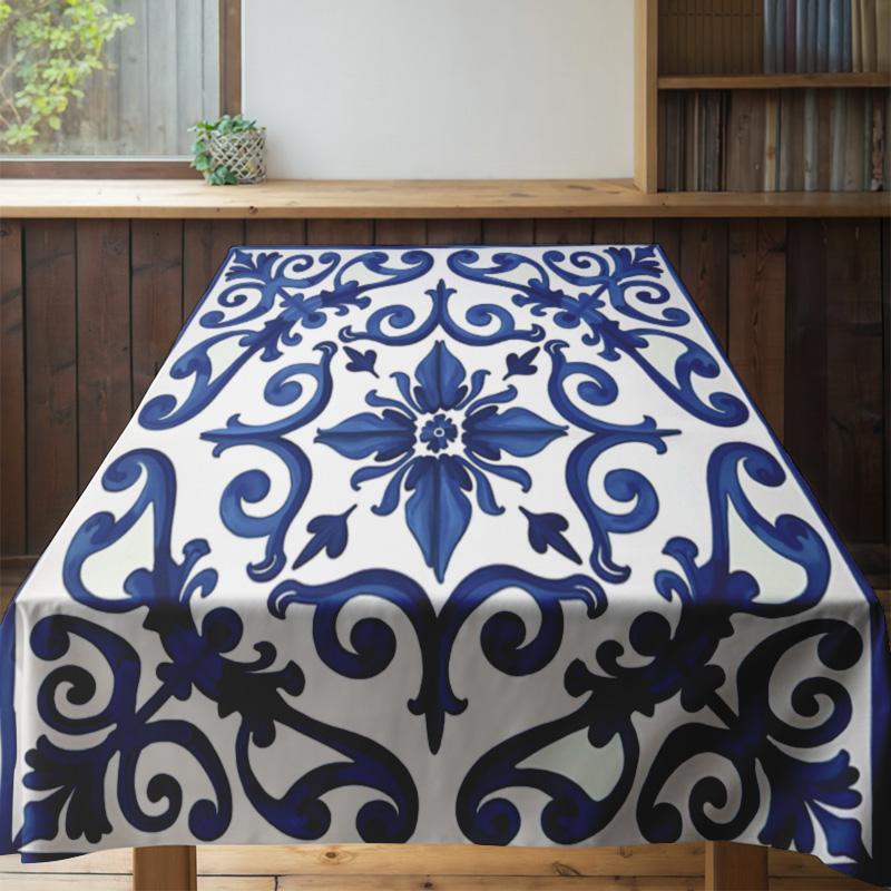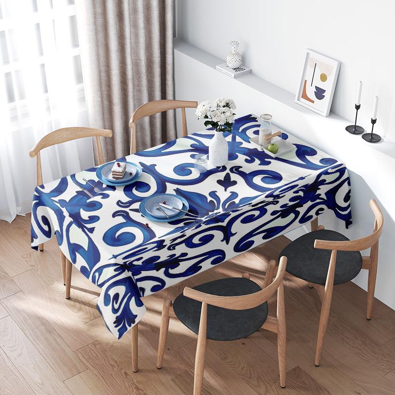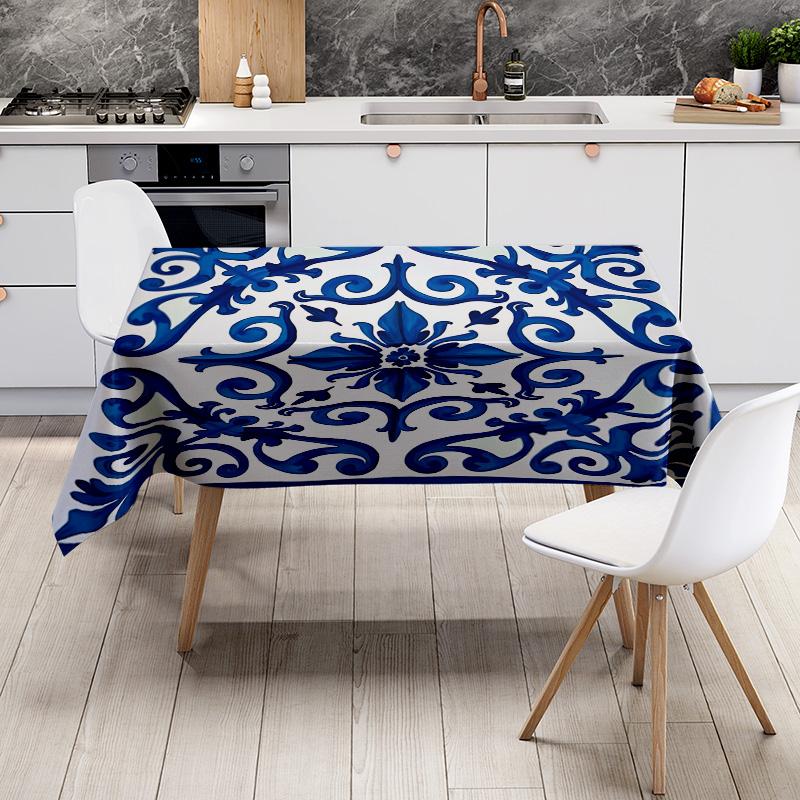 Синяя Белая Скатерть с Цветочным Принтом для Декора Обеденной Комнаты - Мягкая Моющаяся Ткань с Кружевной Отделкой - Доступны Разные Размеры
