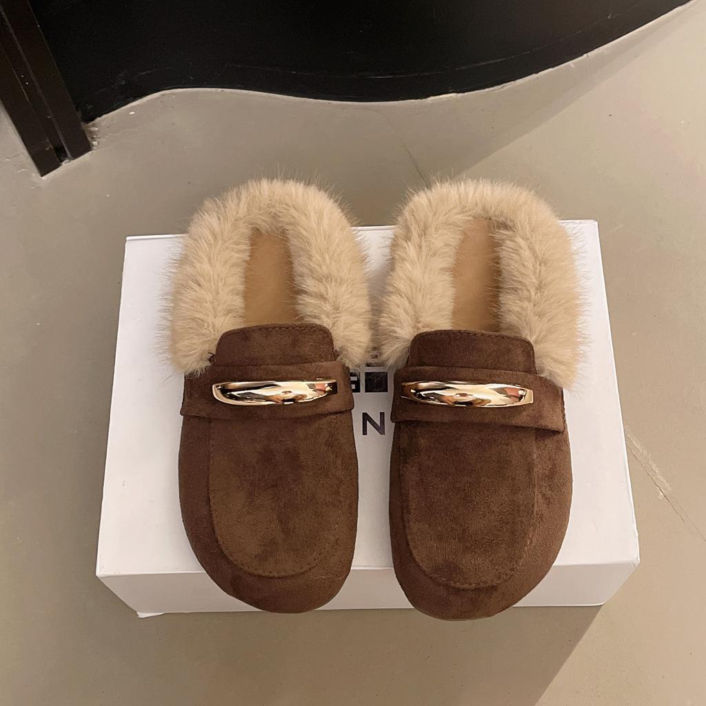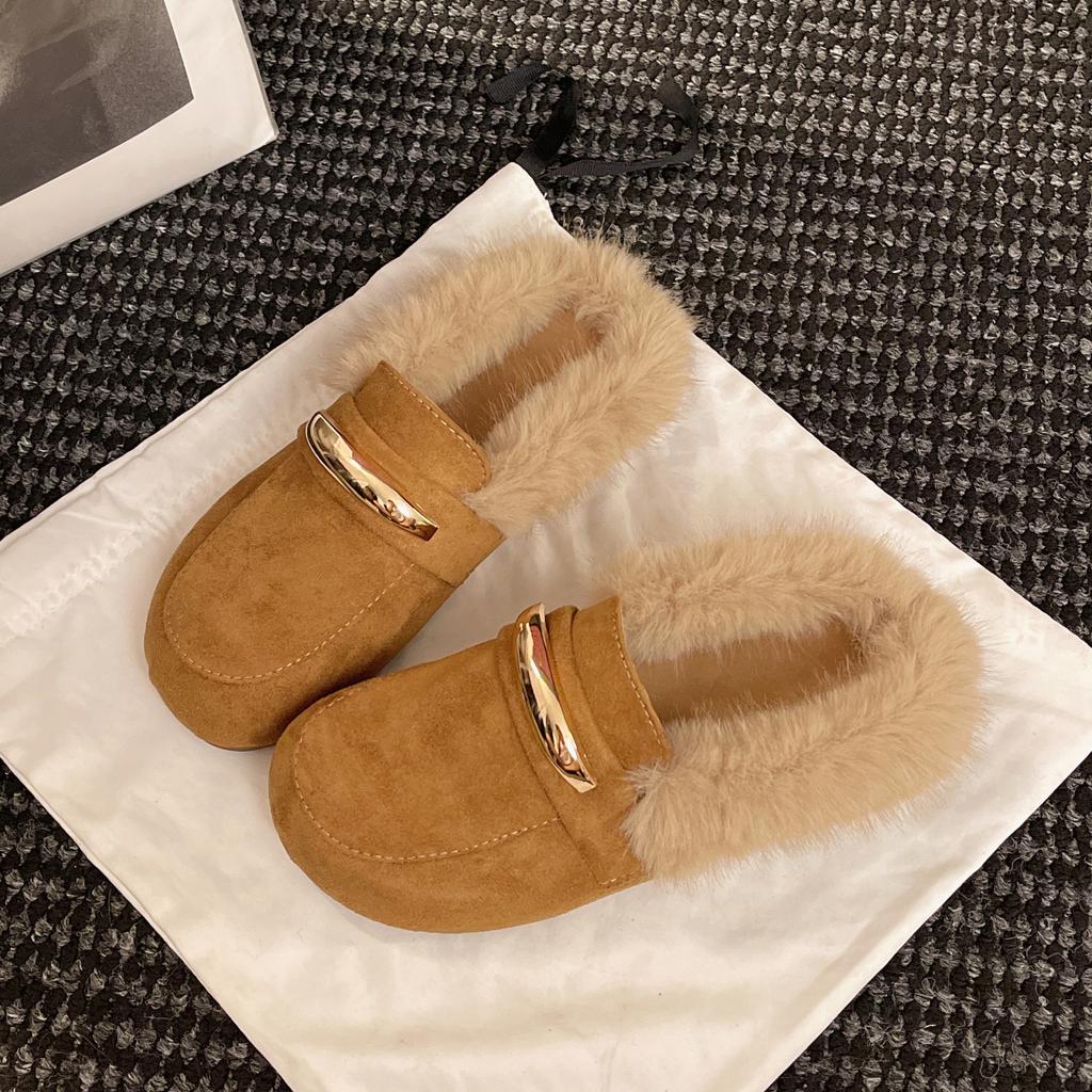 Модные Aphixta 2025 Плоские с теплыми тапочками Замшевый верх Плюшевые пушистые слипоны Мюли Металлическая отделка Лаконичные уличные тапочки