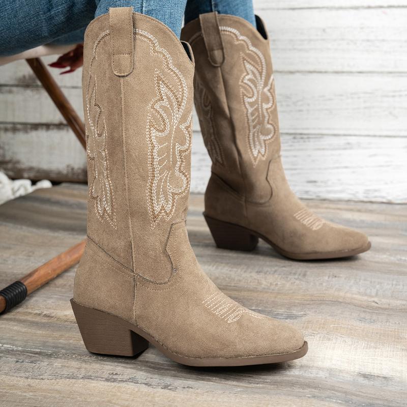 Модные женские ботинки Осень Зима Удобная обувь Высокий толстый каблук Острый носок Женская обувь Сексуальные Модные Вышитые Длинные ботинки